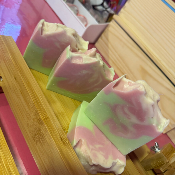 handmade soap is a beautiful fusion of pink and green, with a floral jasmine scent that is perfect for women. The rectangular shape adds a touch of sophistication to this 100% natural product, making it a luxurious addition to any bath or vanity. Enjoy the enchanting aroma and colours of this unique and carefully crafted soap. Ingredients Olive oil Coconut oil Mika powder Essential oils, Jasmine Vegan friendlyi
